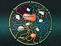 通過計算機(jī)模擬,麻省理工學(xué)院的化學(xué)家發(fā)現(xiàn)了稱為核仁的核體(以橙色描繪)如何與細(xì)胞核中的染色體相互作用,以及這些相互作用如何幫助核仁以穩(wěn)定的液滴形式存在于細(xì)胞核內(nèi)。