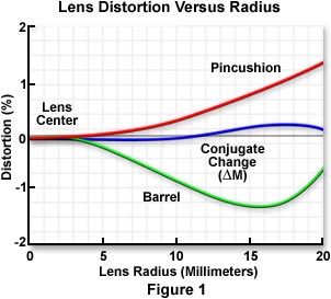 在一般情況下,薄的鏡片顯示出很少或者沒有失真,而較厚的正極和負(fù)極的簡單透鏡將遭受正和負(fù)畸變,分別。?的符號(或類型)和幾何失真的大小依賴于孔徑光闌的位置,相對于所述透鏡(一個(gè)或多個(gè))。?當(dāng)孔徑光闌被放置在一個(gè)正透鏡的前面,主光線不形成在預(yù)測的高斯點(diǎn)的圖像和桶形失真的發(fā)生,而當(dāng)振動膜被放置在透鏡后面(形成出射光瞳),一個(gè)枕形失真效果觀察。