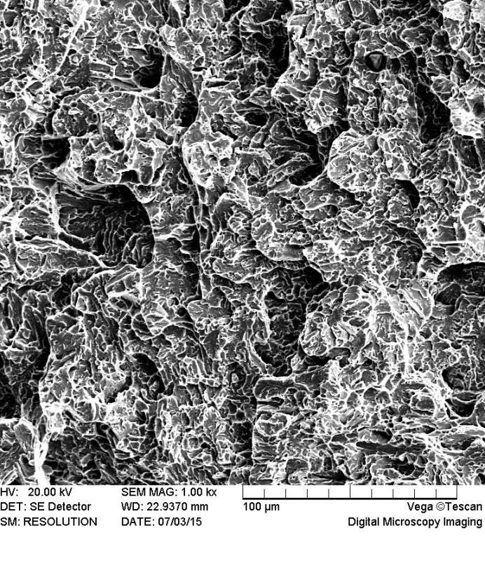 斷口一般有三部分,斷裂源區(qū),裂紋擴(kuò)展區(qū),和瞬斷區(qū),一般擴(kuò)展區(qū)越大,韌窩越密越深,韌塑性越好,從各區(qū)的形貌還可以辨別是疲勞斷裂還是瞬時(shí)脆性斷裂,高拉韌性斷裂等等(個(gè)人見解)此圖可能是擴(kuò)展區(qū)的形貌,纖維狀韌窩明顯,為韌性斷裂。
