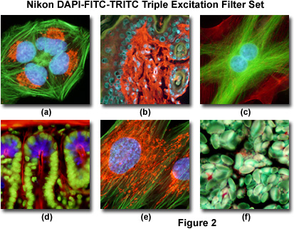 在DAPI-FITC-TRITC三重帶熒光濾波器組合被用于同時檢測所述熒光染料DAPI,F(xiàn)ITC和TRITC具有Zui小交叉的專門設(shè)計(光譜泄放通)相鄰帶之間,并且它也可以與熒光的其它組合采用具有類似的光譜曲線探針。?濾波器組的短波長信號的信道將選擇狹義的光譜區(qū)為紫色激發(fā)和藍(lán)色發(fā)光檢測;?第二,波長較長的信道對應(yīng)于藍(lán)色激發(fā)綠色發(fā)光檢測,以及綠色激發(fā)耦合到橙紅色發(fā)射構(gòu)成濾波器集合的第三頻帶。?短波長激發(fā)傳輸?shù)拇笮?,以提供藍(lán)色發(fā)光的更好的平衡與其他熒光信號,同時也盡量減少漂白刻意降低。?研究從以下三組選擇熒光團(tuán)的各種組合時,此濾波器組建議:DAPI,藍(lán)色熒光蛋白(BFP)或Hoechst 染料(紫色激發(fā));FITC,綠色熒光蛋白(GFP),的Cy2,或Alexa Fluor 488(藍(lán)色激發(fā));?TRITC,紅色熒光蛋白,Cy3的,將Alexa Fluor 546,或美圖跟蹤紅CMXRos(綠色激發(fā))。?在圖2中呈現(xiàn)的圖像表明該過濾器設(shè)置有多種針對不同細(xì)胞內(nèi)位置的熒光探針組合的性能。