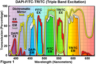 紫外線和尼康DAPI-FITC-TRITC濾波器組合可見光透射光譜曲線下面示于圖1.該濾波器集合時在施加設(shè)計的DAPI,F(xiàn)ITC(異硫氰酸熒光素),和TRITC(四甲基異硫氰酸酯)探針的Zui佳檢測組合,并采用一個激發(fā)濾光器與窄帶通窗中的紫外線(385至400納米),藍(lán)色(475?490納米),綠(545至565納米)的頻譜區(qū)。