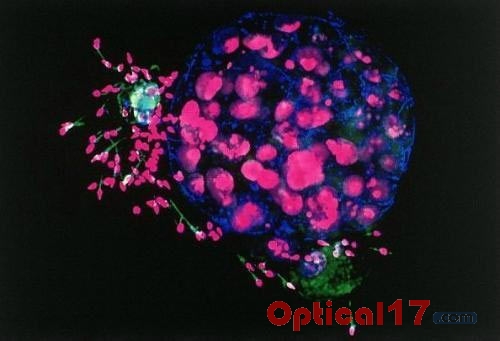 人類胚胎和精子 這看起來像個(gè)戰(zhàn)事不斷的世界,但事實(shí)上它是一個(gè)受精5天后的卵子,一些精細(xì)胞仍粘貼在它表面。這張色彩艷麗的美麗圖片,是利用共聚焦顯微鏡拍攝的。胚胎和精細(xì)胞核呈紫色,而精子的尾巴是綠色。藍(lán)色區(qū)域是縫隙連接(gap junction),它們把細(xì)胞彼此聯(lián)系在一起。