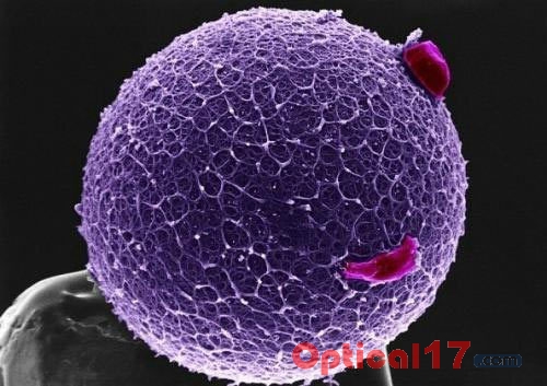 帶有冠細(xì)胞的人類卵子 這張彩色圖片上的紫色人類卵子坐落在一個(gè)柱狀物上。它上面包裹一層透明帶狀物——醣蛋白,這種物質(zhì)既具有保護(hù)卵細(xì)胞的作用,又能誘捕和限制精子。兩個(gè)紅色冠細(xì)胞粘貼在透明帶狀物上。
