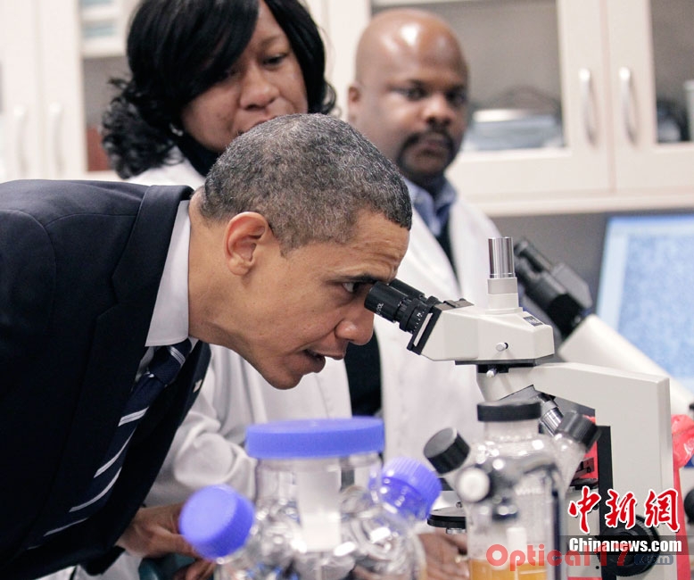 美國總統(tǒng)奧巴馬參觀社區(qū)大學并試用顯微鏡