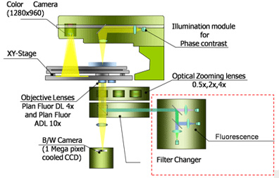微觀視圖(倒置顯微鏡和B/W單色相機(jī))